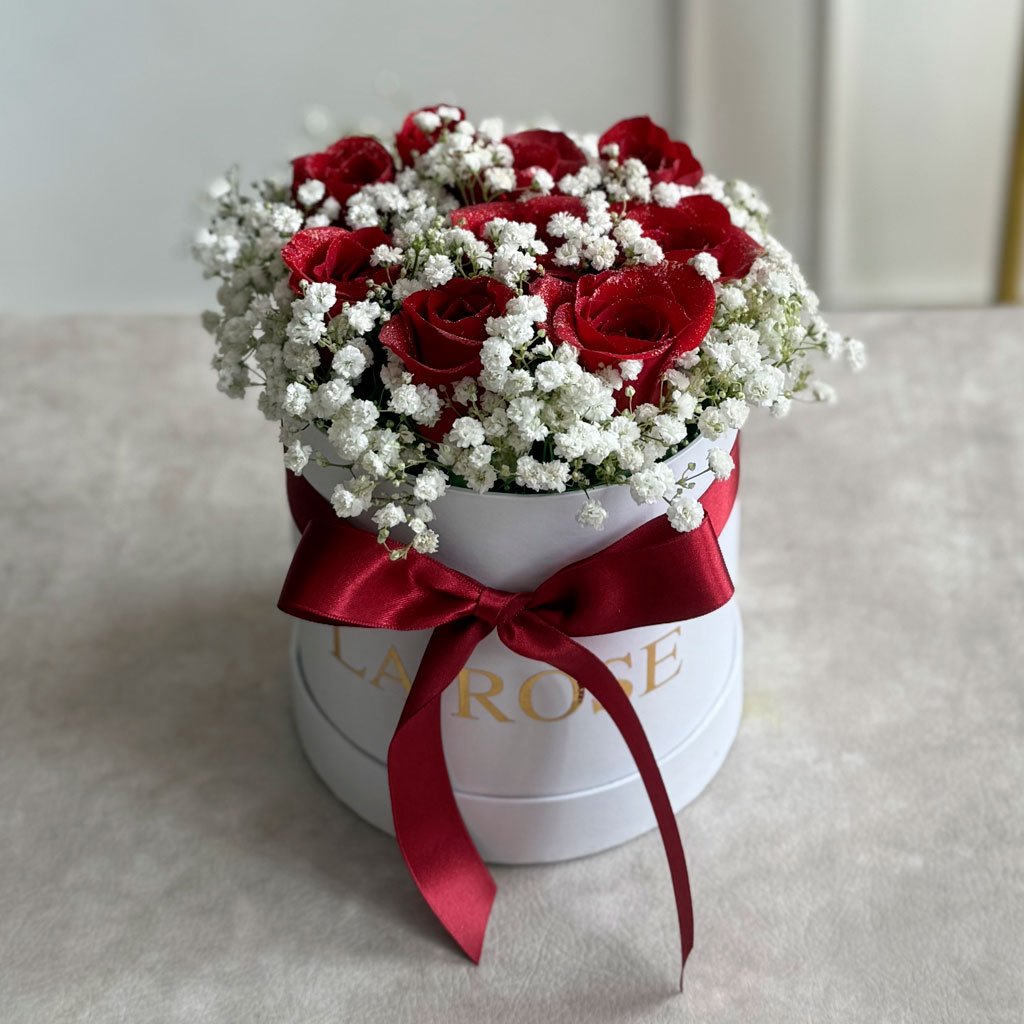 Una delicada caja de rosas rojas rodeadas de gipsófila blanca.