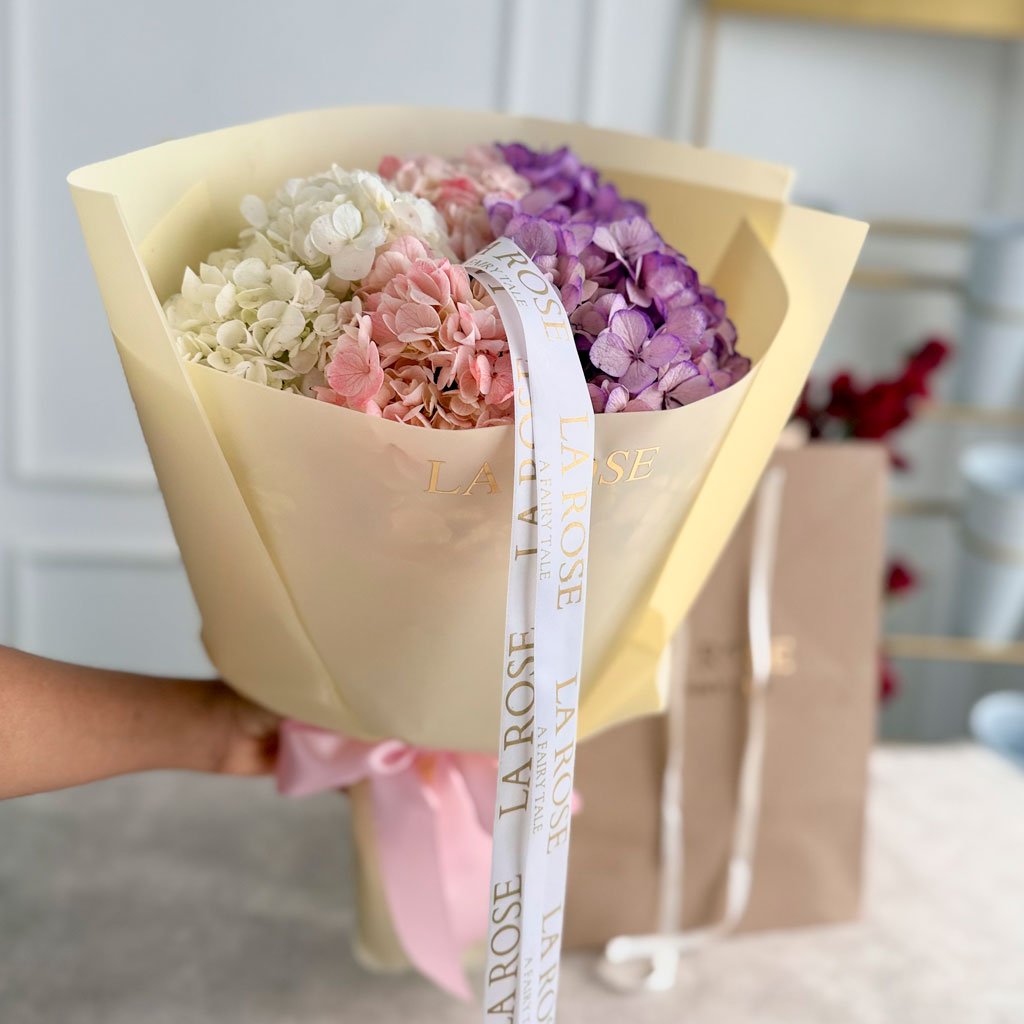 Este ramo combina hortensias naturales en blanco, rosado durazno y lila —una paleta armoniosa que transmite calma, ternura y belleza atemporal.